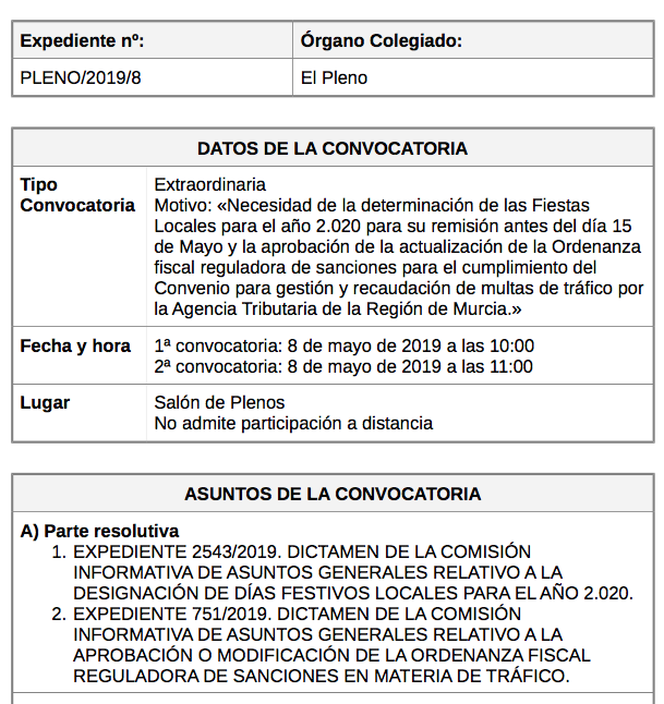 El Pleno del Ayuntamiento abordará el miércoles la actualización de la Ordenanza fiscal para las multas de tráfico, así como, entre otros temas, la determinación de las Fiestas Locales para el año 2020 para su remisión antes del día 15 de mayo. La sesión comenzará a las 10 horas, en primera convocatoria.