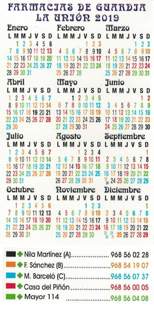 Ofrecemos actualizado el calendario de guardias de los cinco establecimientos ubicados en la ciudad de La Unión que cada año edita centro médico Herrerías.