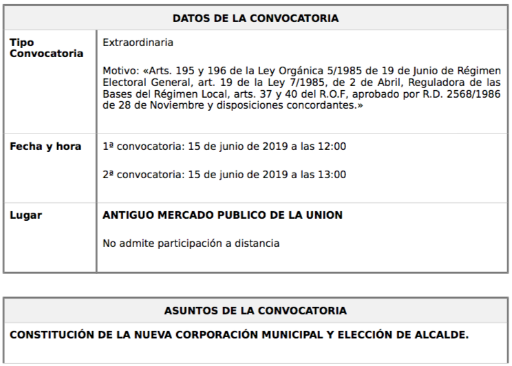 El ayuntamiento de La Unión convoca para este sábado, a las 12 horas en el Antiguo Mercado Público, la sesión en la que quedará formada la nueva corporación municipal y en la que se procederá a la elección de alcalde.powered by social2s