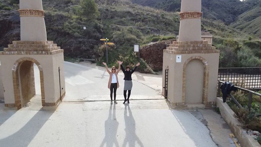 Patricia Campillo y Ana Larios, de la Agencia de Desarrollo Local del Ayuntamiento de La Unión, felicitan la Navidad a los vecinos desde la entrada del Parque Minero.