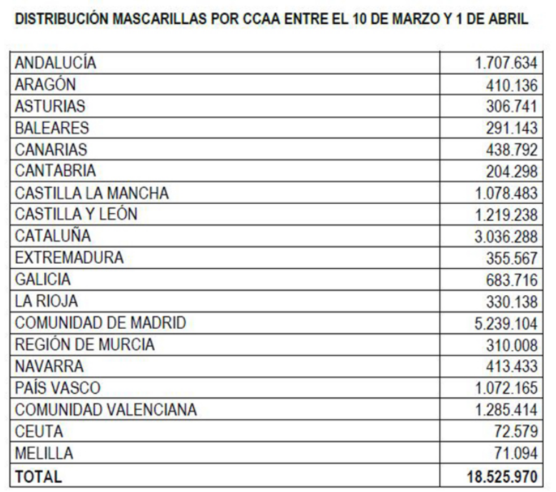 - El Gobierno distribuye 18,5 millones de mascarillas entre las autonomías y edita una guía para las empresas interesadas en fabricarlas