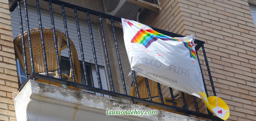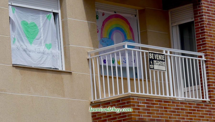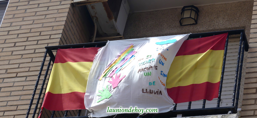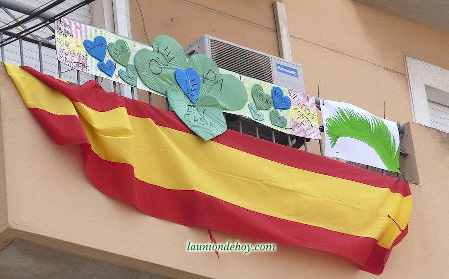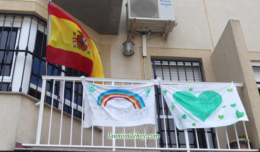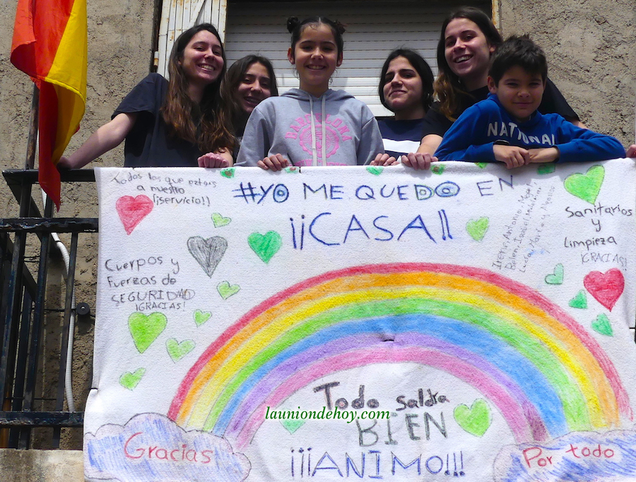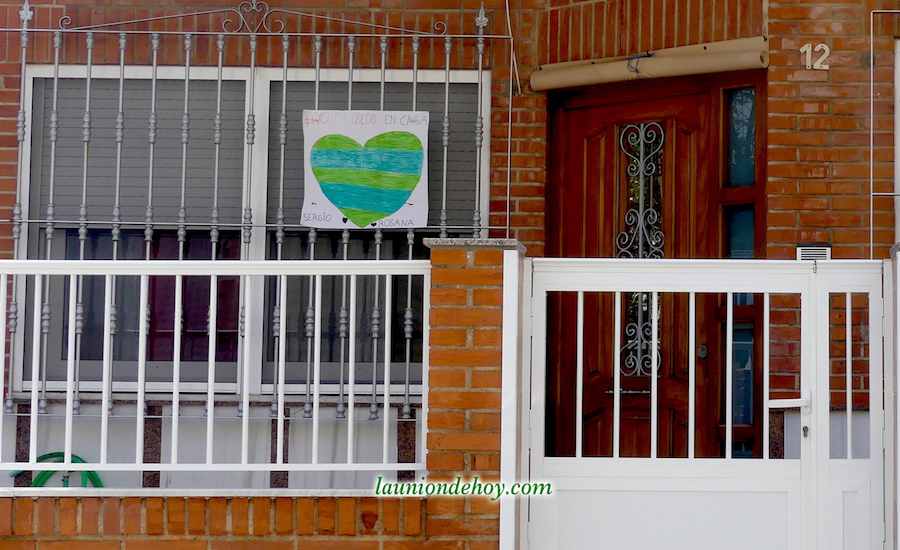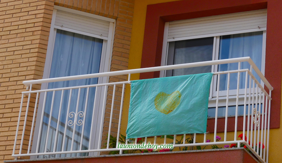 La foto superior con el grupo de jóvenes está captada en un balcón de la calle Balmes. Más abajo se observa una tomada en la Carrera de Irún, donde los corazones y mensajes se acompañan de una bandera de España con crespón negro en señal de luto por los fallecidos generados por el Covid-19.