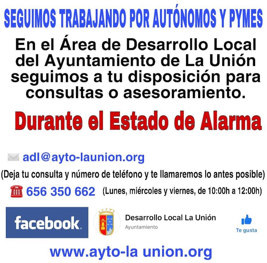 La Agencia de Desarollo Local del Ayuntamiento de La Unión sigue trabajando para asesorar y ayudar a los autónomos y pequeñas y medianas empresas del municipio. Para ello, ha habilitado una dirección de correo y un teléfono en los que podrán realizar las consultas o dudas que se tengan sobre las ayudas que el Gobierno de España ha establecido durante el 'Estado de alarma' en relación a estos colectivos.