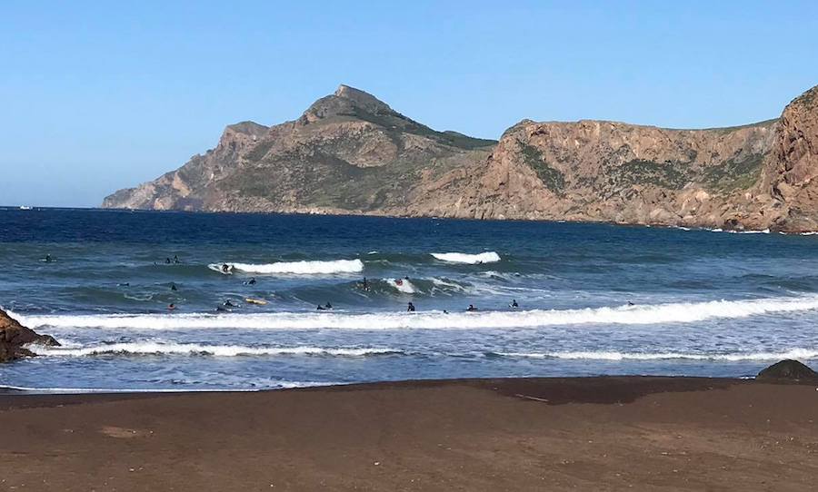 Policía Local y Guardia Civil se han personado esta mañana en la playa de Portmán, donde se encontraban unos cincuenta surfistas, a quienes han informado de la normativa sobre la práctica de deportes acuáticos.