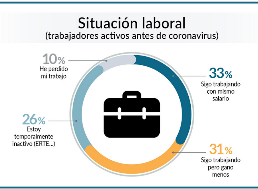 Teniendo en cuenta a quienes estaban trabajando antes de la crisis del coronavirus, solo el 33% continúa trabajando sin haber visto reducidos sus ingresos. El resto de los encuestados ha perdido parte de su salario o ingresos (31%), está temporalmente inactivo (26%) o ha perdido su empleo (10%).
