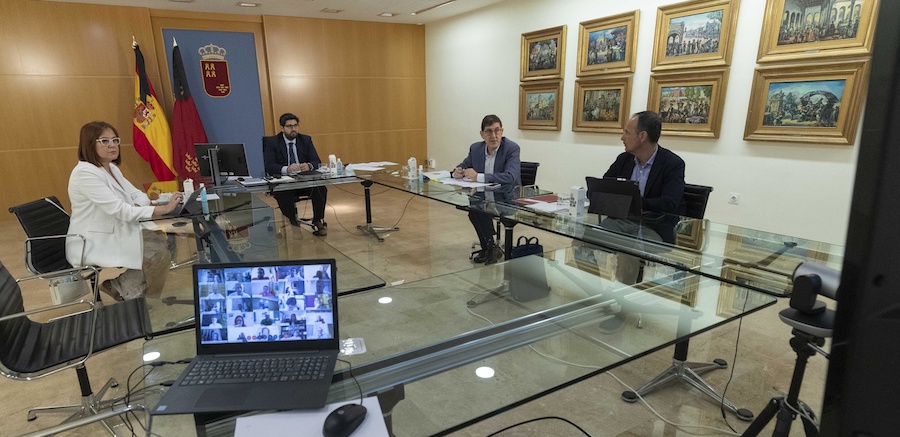 El presidente de la Comunidad, Fernando López Miras, mantuvo hoy un encuentro por vía telemática con los alcaldes de todos los municipios de la Región para abordar las actuaciones relacionadas con el covid-19, donde acordaron elaborar “un protocolo de recomendaciones y buenas prácticas de actuación en playas para que quienes quieran disfrutar de ellas puedan hacerlo en condiciones de seguridad tanto desde el punto de vista del distanciamiento como el de la higiene”, dijo el consejero de Presidencia y Hacienda, Javier Celdrán, al término de la reunión.