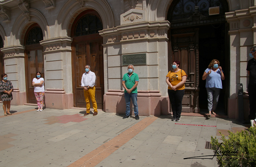 A las doce horas se ha celebrado en toda España un minuto de silencio en recuerdo a las cerca de veintiocho mil víctimas, especialmente mayores, que han fallecidos por el Covid-19. En la imagen, ese momento ante la sede del Ayutamiento de La Unión.