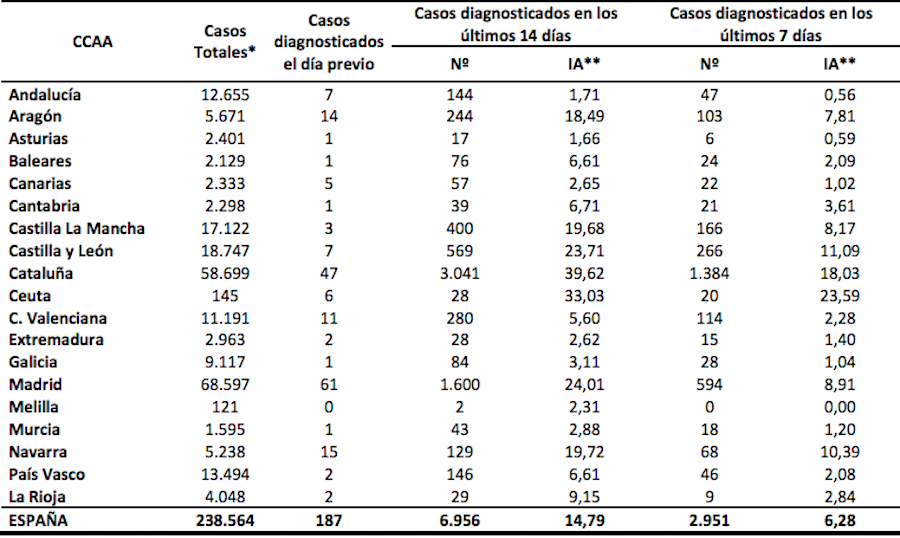 El ministerio de Sanidad informa que en las últimas 24 horas se han registrado 187 nuevos casos (61 de Madrid y 47 de Barcelona) y que en la última semana han fallecido 39 personas (2 ayer), han sido hospitalizados 286 enfermos y han entrado 12 en UCI. También informa que 63 han sido los sanitarios fallecidos y que el 87% de los que se han contagiado del virus han sido dados de alta. La mayoría de estos contagios han tenido lugar en Madrid y en Cataluña.
