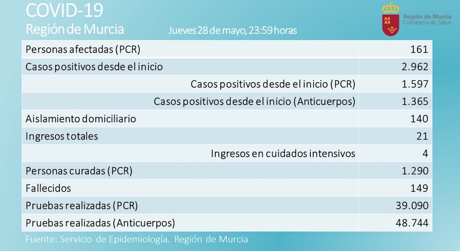 El ministerio de Sanidad informa que en el último día hay 187 nuevos casos de coronavirus en España y la consejería de Sanidad publica tres hospitalizaciones menos en la Región