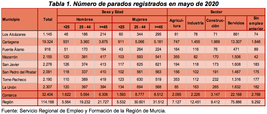A 31 de mayo, la Región de Murcia tiene registrados 114.168 trabajadores desempleados. Hay que decir que estos datos no contabilizan las personas que se encuentran aún en un Expediente de Regulación Temporal de Empleo (ERTE), que desde mediados de marzo hasta el 31 de mayo ha supuesto que más de 78.000 personas en nuestra región hayan dejado su trabajo y engrosado temporalmente las listas del desempleo.