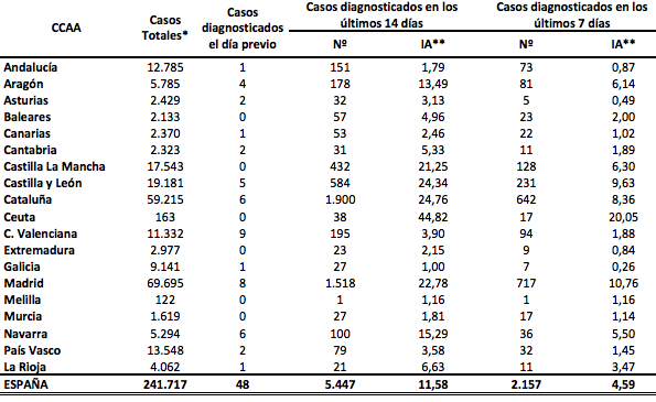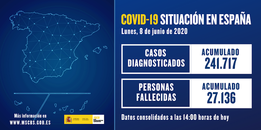 Las cifras del último día reflejan 48 nuevos casos, siendo la primera vez desde el inicio de la crisis sanitaria en que la cifra está por debajo del medio centenar. Respecto a los fallecidos, el ministerio comunica que no tiene datos de que se haya producido alguno en las últimas 24 horas. Respecto a la última semana, la cifra es de 56, de los que 31 corresponden a la Comunidad de Madrid.