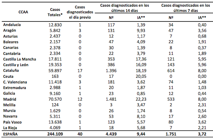 En el último día, el ministerio de Sanidad ha informado que el total de nuevos infectados ha sido de 40 personas, de los que 17 se sitúan en Cataluña y 12 en Madrid. Fallecidos hay 25 en la última semana, pero se indica que la cifra total lleva varios días sin variar debido a que faltan datos de las comunidades autónomas.