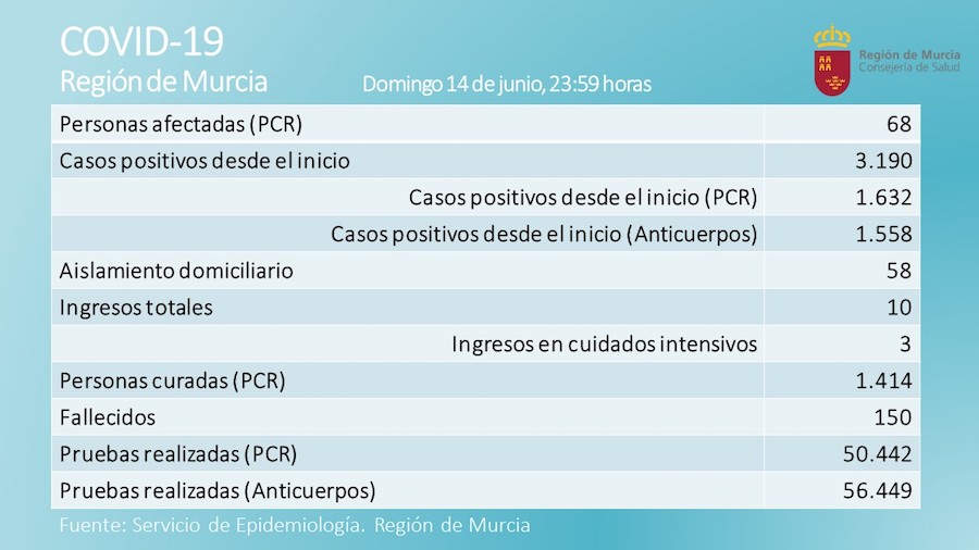 En cuanto a la Región de Murcia, la única variación respecto al domingo es un curado más, con lo que quedan 68 afectados de los que 10 están hospitalizados en hospitales regionales.
