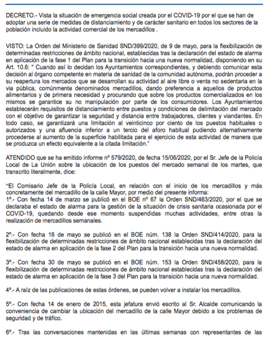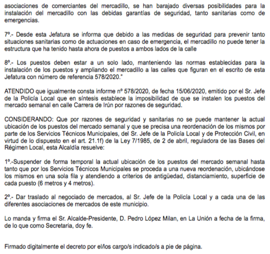 Esta mañana, el Alcalde, Pedro López Milán, tras ser informado por los Servicios técnicos y el Comisario Jefe de la Policía Local, ha firmado un Decreto por el que sigue suspendido el mercadillo de los martes hasta que se lleve a cabo la nueva ubicación de los puestos que forman parte del mismo. Todo ello atendiendo a las medidas de distanciamiento y de carácter sanitario, enmarcadas dentro de la situación de emergencia social creada por el COVID-19.