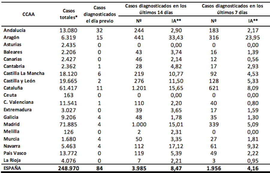 Hay detectados unos 50 rebrotes activos por coronavirus, siendo los más importantes el que se sitúa en Aragón con unas trescientas personas afectadas. Por contra, Asturias, tras 14 días sin nuevos infectados, se considera que es una comunidad autónoma libre de virus.