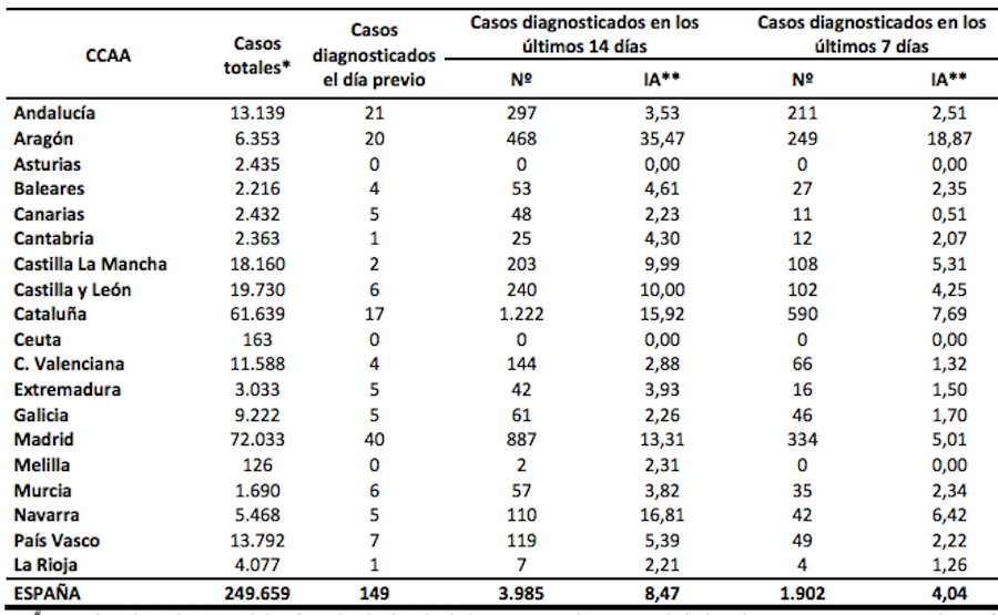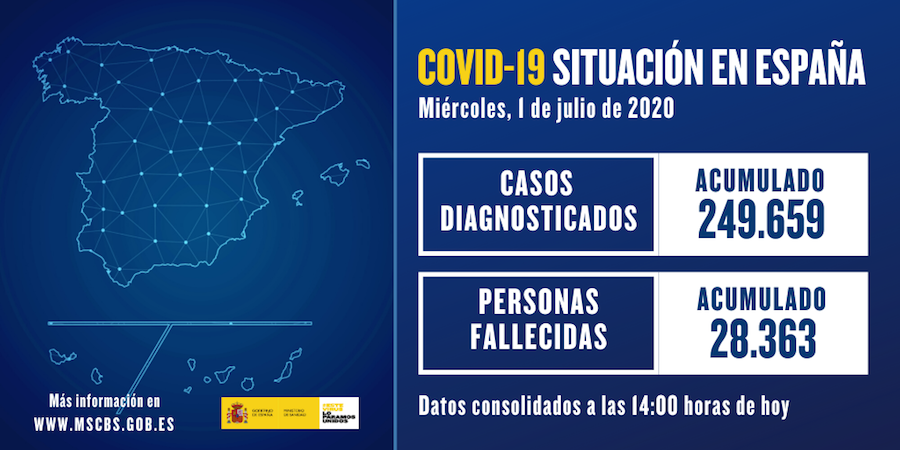En lo referente a España, la cifra de nuevos contagios en las últimas 24 horas es de 149, medio centenar más de los registrados el día anterior, siendo la mayoría localizados en Aragón, Andalucía y Madrid, mientras que Asturias lleva ya quince días sin nuevos infectados. Los fallecidos en la última semana son 19, con 151 hospitalizados (9 en UCI) en el mismo período.