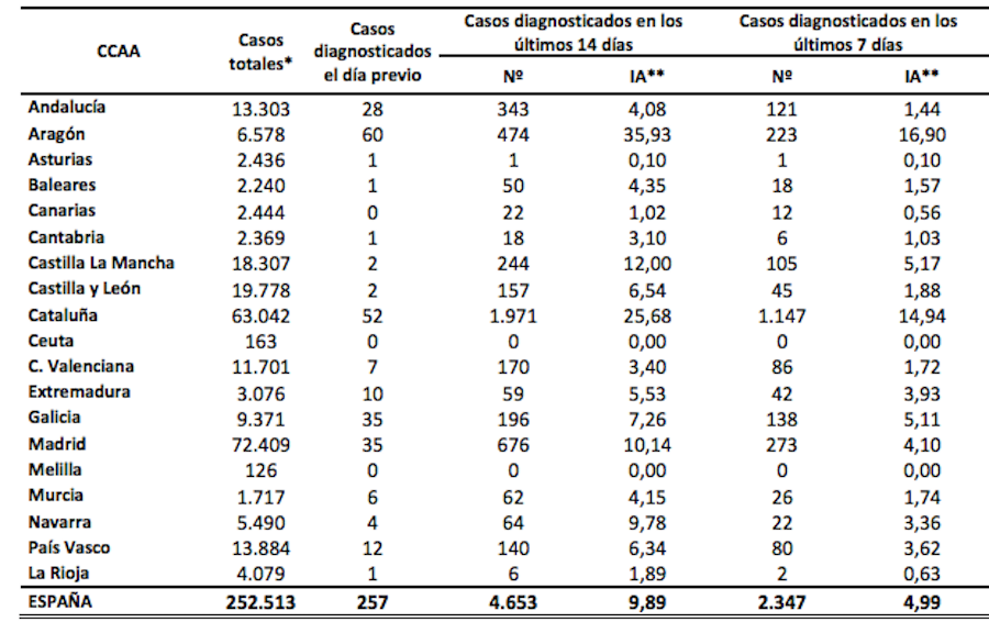 A nivel de España, se registran 257 casos en el último día, que es la cifra más alta registrada desde la Fase 2.