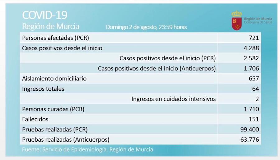 El número de afectados total en la Región de Murcia desde el inicio del brote de esta pandemia asciende a 4.288 personas. De ellas, 2.582 casos han sido acreditados mediante PCR. El número de casos activos asciende a 721 personas.
