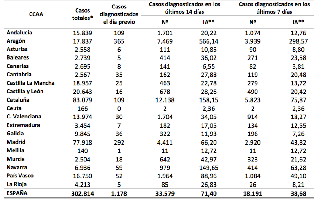 El incremento del último día es de 9 personas, mientras que el incremento de afectados actuales experimenta un incremento de 25 infectados. Las hospitalizaciones también van al alza en España, con 594. Los casos nacionales de las últimas 24 horas es de 1.179, con 6 fallecidos. El total oficial ya supera los trescientos mil diagnósticos positivos desde el inicio de la pandemia.