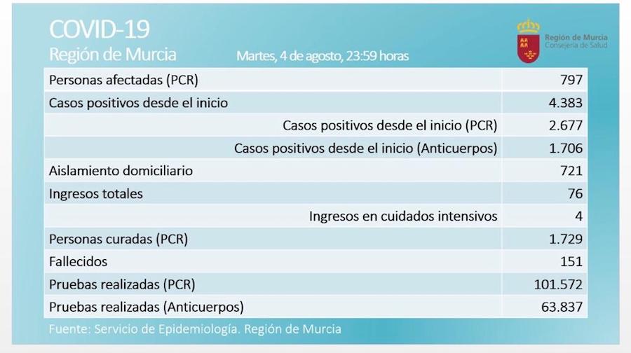 El número de afectados total en la Región de Murcia desde el inicio del brote de esta pandemia asciende a 4.383 personas. De ellas, 2.677 casos han sido acreditados mediante PCR. El número de casos activos asciende a 797 personas.