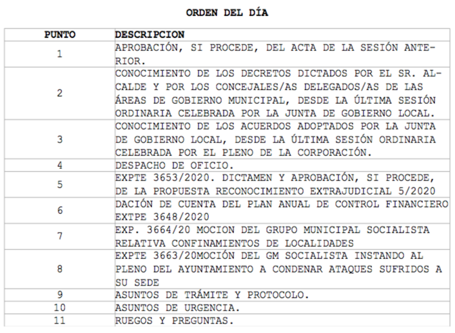 La sesión ordinaria de septiembre tendrá lugar el 29 de septiembre a las 17 horas en primera convocatoria y a las 18, en segunda. En el orden del día figuran sendas mociones del grupo municipal socialista relativas al confinamiento de localidades y de condena a los ataques vandálicos sufridos en su sede.