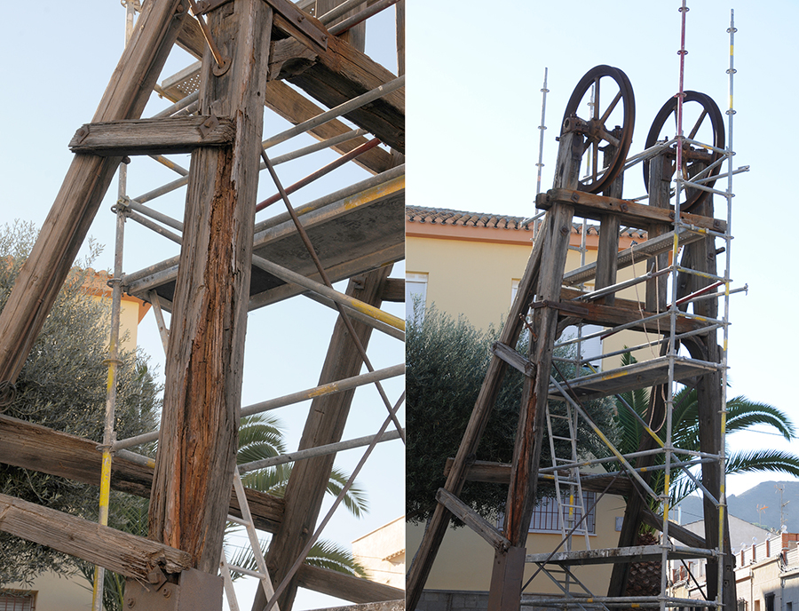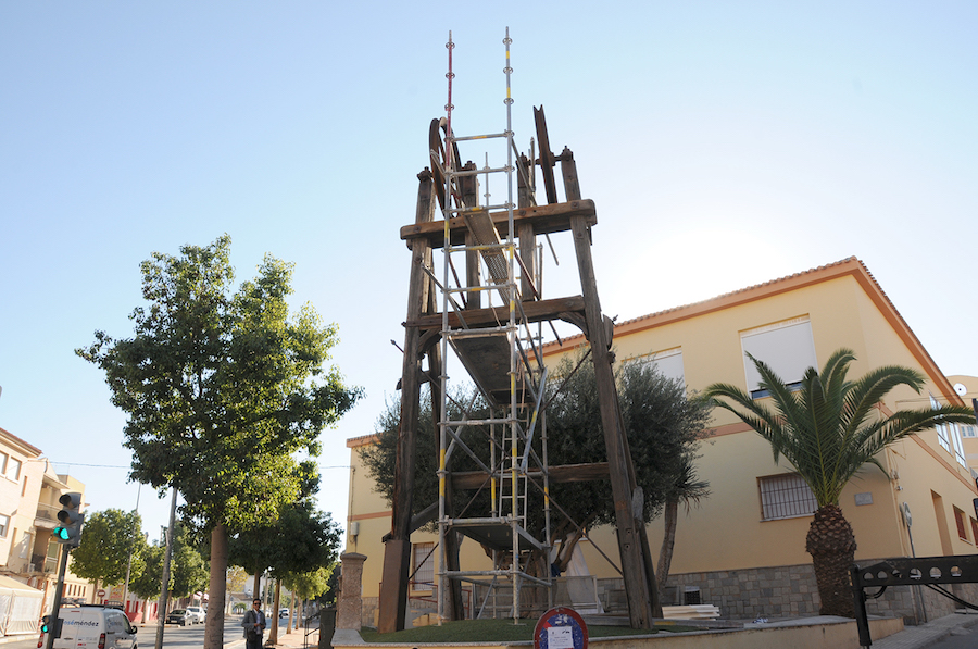 La estructura de madera ubicada junto al busto de Asensio Sáez frente al centro que lleva el nombre del ilustre unionense se ha visto atacada por estas larvas, por lo que el Ayuntamiento de La Unión ha contratado a una empresa especializada para el desmontaje para, bajo la supervisión de la consejería de Cultura, proceder a su restauración.