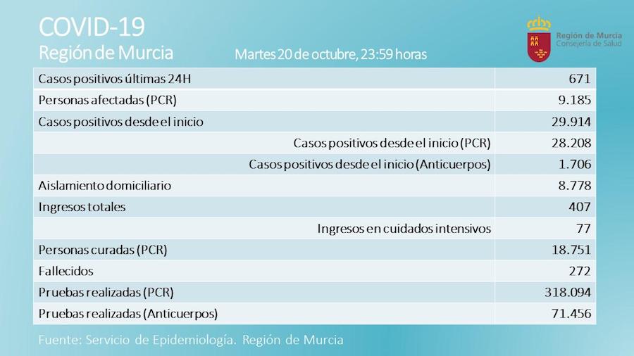 De los 671 nuevos casos, 219 corresponden al municipio de Murcia, 83 a Cartagena, 28 a Molina de Segura, 24 a Alcantarilla, 24 a San Javier, 23 a Caravaca de la Cruz, 19 a Cieza, 18 a Jumilla, 17 a Torre Pacheco, 16 a Yecla, 13 a Los Alcázares, 13 a Totana, 13 a La Unión, 12 a Alhama de Murcia, 12 a Bullas, 12 a Fuente Álamo, 10 a Ceutí, 10 a Lorca, 9 a Mula, 8 a Archena y a Cehegín, 7 a Águilas, 5 a Abarán, a Fortuna, a Mazarrón y a Santomera. El resto están repartidos entre diversas localidades.