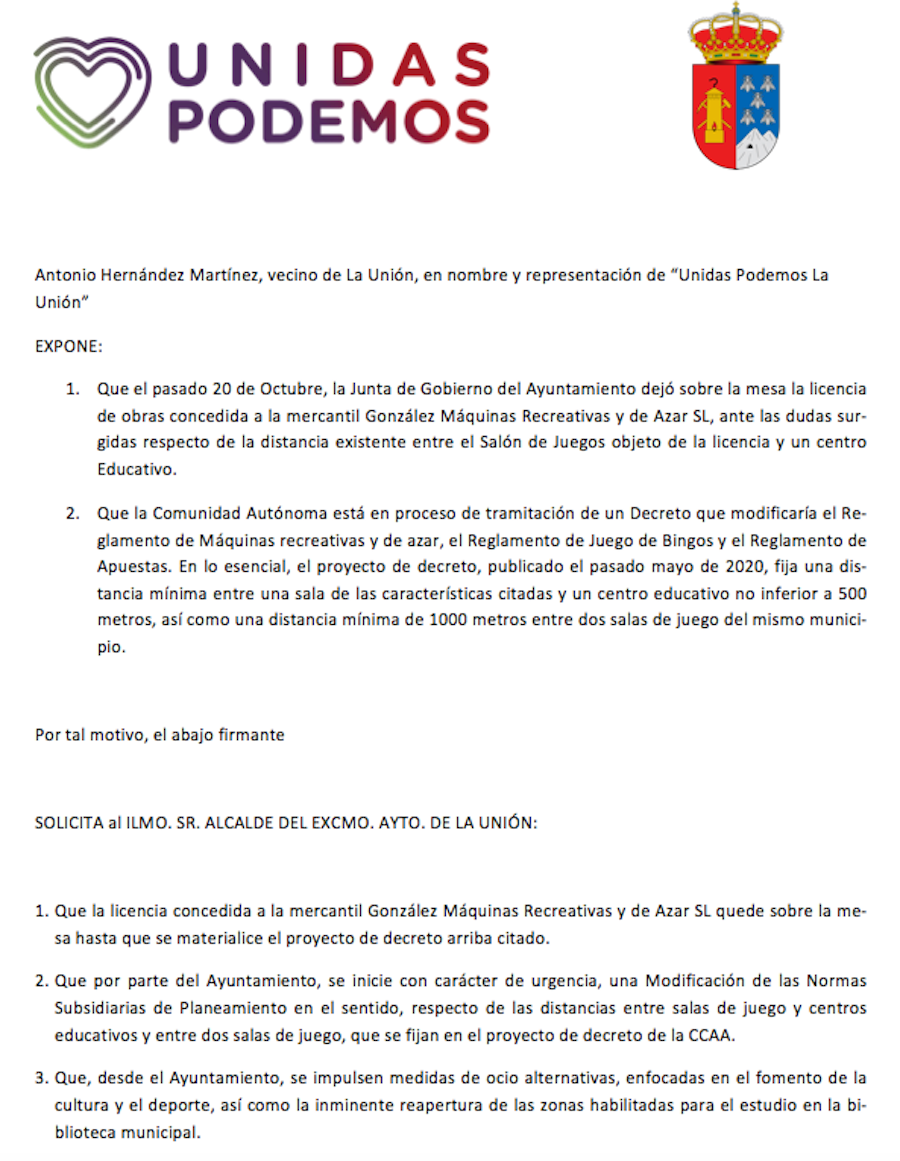 Unidas Podemos de La Unión solicita al Ayuntamiento que no autorice la instalación de un local de este sector que se ha presentado hasta que se materialice el decreto que ultima la Comunidad Autónoma al existir dudas sobre si se respeta la distancia mínima con centros educativos. También solicita al Gobierno local que se impulsen actuaciones de ocio saludable que alejen "a los jóvenes de estas casas de apuestas", indican.