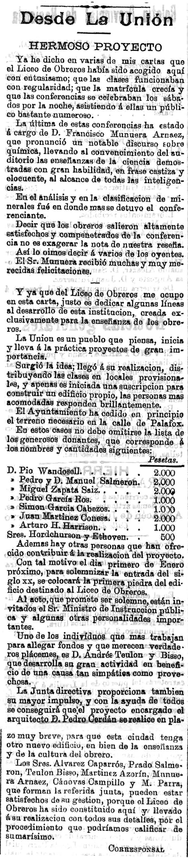 El ejemplar de 'Las provincias de Levante' de fecha 26 de diciembre de 1900 informaba del 'Hermoso proyecto' que iba a tener La Unión con un Liceo de Obreros "que ha sido acogido aquí con entusiamo", detallando después la labor de la institución y exponiendo frase como “La Unión piensa, inicia y lleva a la práctica proyectos de gran importancia”, y en este caso un proyecto creado en exclusividad para la enseñanza de los obreros. Después indicaba que el Ayuntamiento cedía un terreno en la calle Palafox y publicaba la lista de los generosos donantes. Se anunciaba la colocación de la primera piedra para el inminente uno de enero, a las tres de la tarde, con un solemne acto.