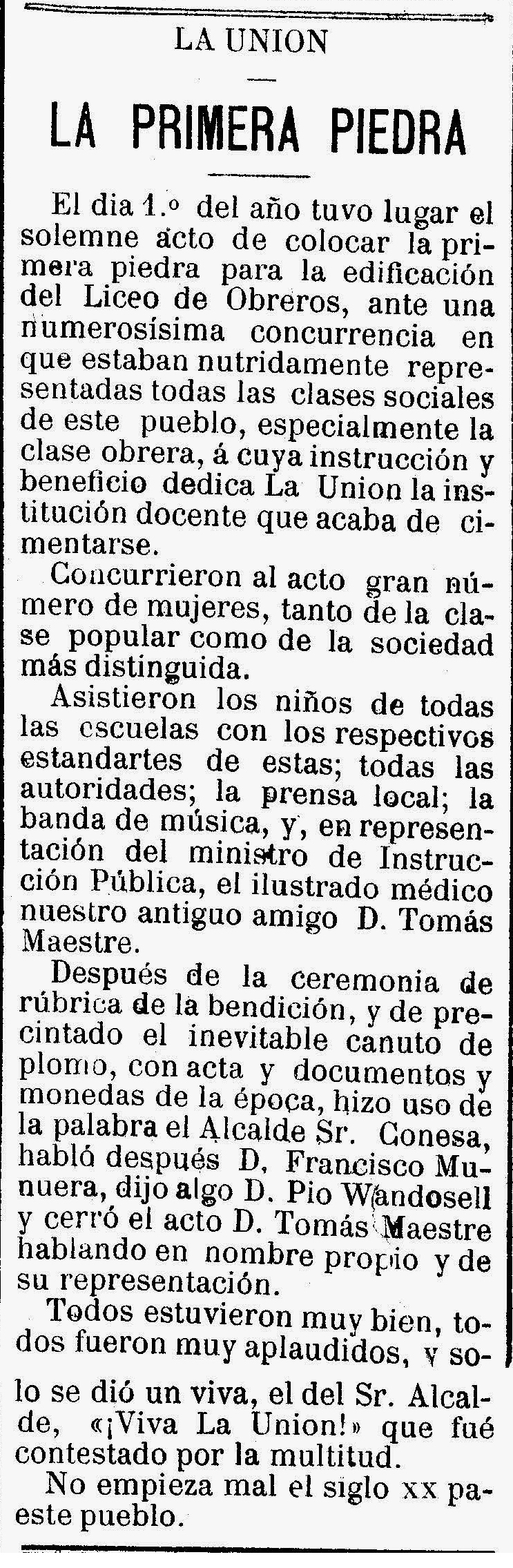 'Diario de Murcia' ya ofrecía crónica de ese esperado acto con el título 'La primera piedra', señalando "una numerosísima concurrencia" de todas las clases sociales del pueblo, incluidas mujeres, niños, prensa local y banda de música, figurando entre las autoridades un representante del ministro de Instrucción Pública. "Después de la ceremonia de rúbrica de la bendición, y de precintado el inevitable canuto de plomo, con acta y documentos y monedas de la época, hizo uso de la palabra el Alcalde Sr. Conesa, hablo después D. Francisco Munuera, dijo algo D. Pio Wandosell y cerró el acto D. Tomás Maestre...". Cerró el alcalde con un "¡Viva La Unión!, que fue contestado por la multitud. No empieza mal el siglo XX para este pueblo", reseña.