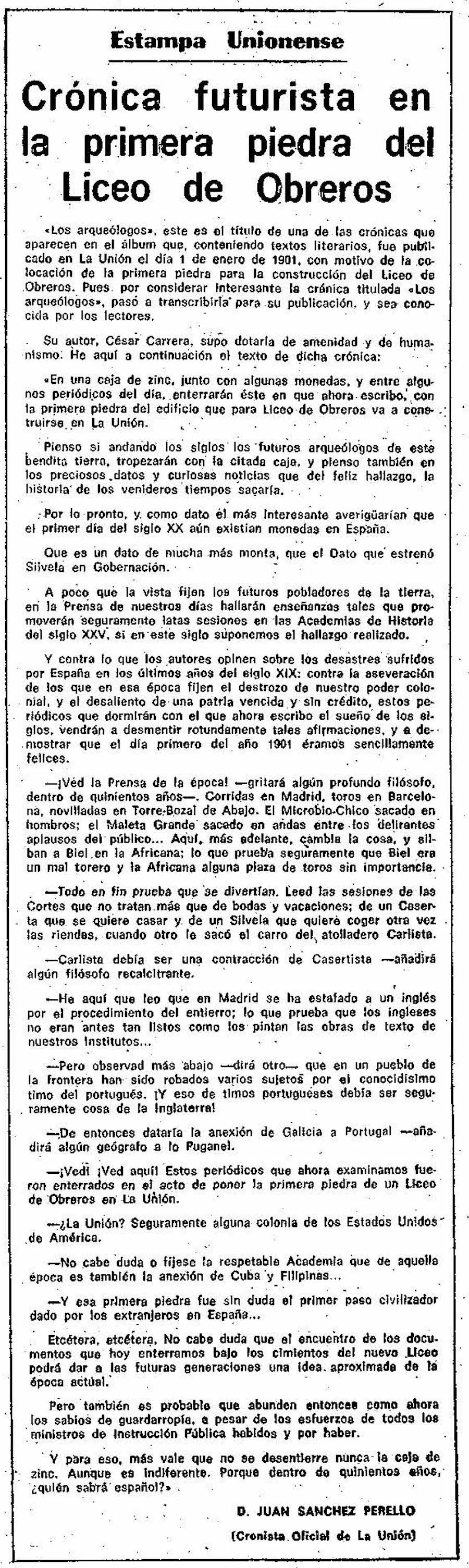 Y pasaron los años y la caja del tiempo seguía firme bajo tierra, pero se borraba su existencia de la mente de los unionenses con el paso de las generaciones. Fue el 11 de noviembre de 1982 cuando Juan Sánchez Perelló, cronista oficial de La Unión, vuelve a hablar de su existencia en el periódico 'Línea' de la Región de Murcia, donde tenía la sección 'Estampa unionense'. Bajo el título 'Crónica futurista en la primera piedra del Liceo de Obreros' se refería al acto que tuvo lugar el primer día del año 1901 y transcribía algunos párragos de un artículo publicado entonces titulado 'Los arqueólogos', cuya crónica recogía: "En una caja de zinc, junto con algunas monedas, y entre algunos periódicos del día, enterraban éste en que ahora escribo, con la primera piedra del edificio que para Liceo de Obreros va a construirse en La Unión".