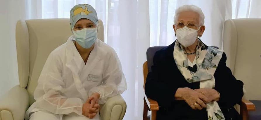 Nacida en 1924, vive en la residencia de mayores Los Olmos de Guadalajará desde 2003. Junto a una auxiliar de enfermería del centro, Mónica Tapias (48 años de edad), esta mañana han recibidos las primeras dosis de la campaña de inmunización contra la pandemia que ha comenzado por productos de la farmacéutica Pfizer.