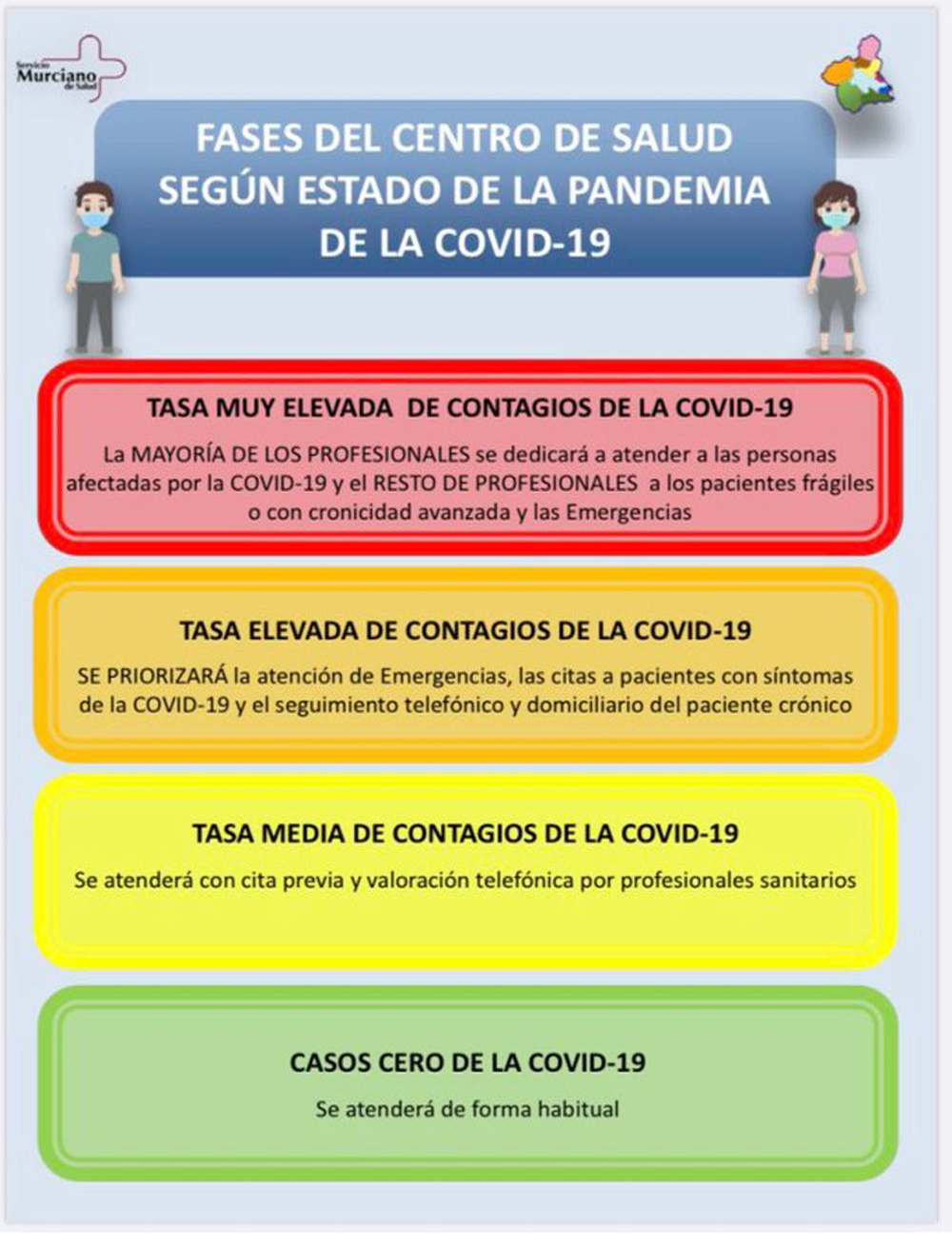 El Área de salud de Cartagena tiene en la fase de tasa muy elevada de casos positivos Covid-19, nivel rojo, a 12 zonas: Barrio Peral, Pozo Estrecho, Cartagena Oeste, Cartagena Este, Los Dolores, San Antón, La Unión, Casco Antiguo, Mazarrón, Los Barreros, Santa Lucía y Molinos Marfagones.