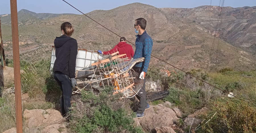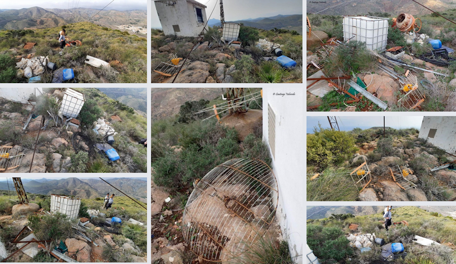 Sin embargo, lo más destacable de la actuación, por el ingente esfuerzo que ha supuesto para los participantes en estas jornadas de limpieza, ha sido la retirada de unos 800 kg. de chatarra y restos de todo tipo de basura que habían sido abandonados por la anterior corporación municipal de La Unión en lo alto del Cabezo de La Galera, en unas instalaciones de un repetidor de televisión en desuso. La instalación de estas antenas de comunicaciones se realizó hace más de 10 años en un espacio de alto valor ecológico llevando las herramientas y todos los materiales hasta lo alto de la cumbre en helicóptero. Una vez que la antena quedó instalada, todo el material fue abandonado en la cumbre y allí ha permanecido hasta que, durante este fin de semana, ha tenido que ser bajado penosamente a mano por voluntarios de la asociación por mitad del monte. Algunos de los objetos abandonados que han tenido que ser transportados eran extraordinariamente voluminosos y pesados, tales como una hormigonera, una pastera o un depósito de agua de 1.000 litros.