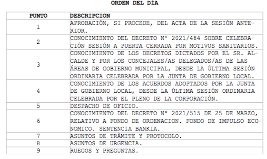 La sesión ordinaria, que continuará siendo a puerta cerrada por seguridad sanitaria, comenzará a las cinco de la tarde en primera convocatoria (18 horas en segunda) en el salón de plenos de la sede municipal de la Casa del Piñón.