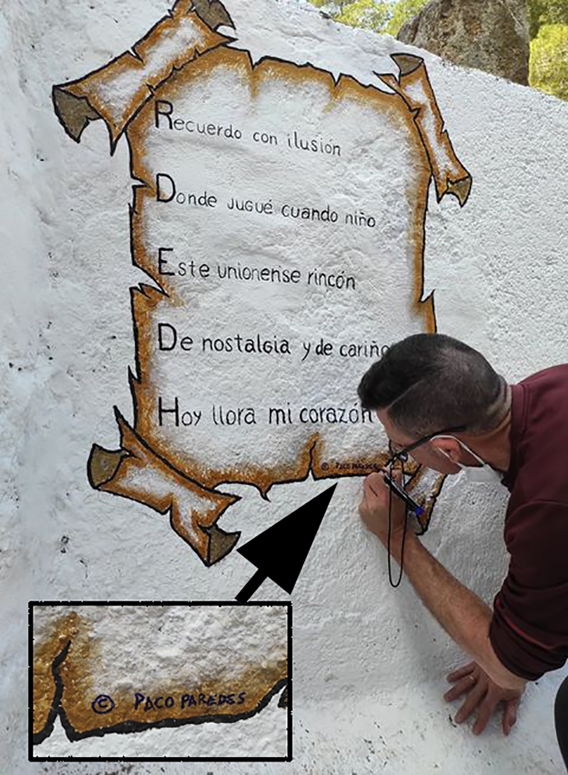 Iván Ruipérez y Paco Paredes se han dado la mano para plasmar en uno de los muros del paraje unionense un papiro con un sentido trono que invita a todo el que acuda a disfrutar y a cuidar este entorno de naturaleza.