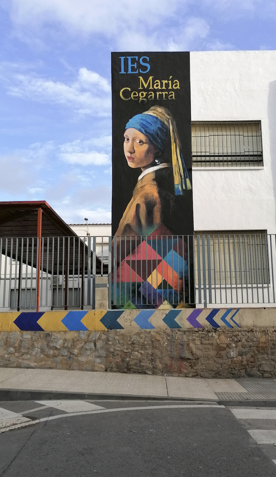 El mural de la fachada tiene como referencia el famoso retrato del pintor holandés Johannes Vermeer titulado “La joven de la perla”. El enigmático rostro de esta joven busca con la mirada una relación virtual con el espectador, recortada en un fondo oscuro cargado de misterio. Sobre este enorme rostro puede leerse el nombre de otra mujer a la que rinde homenaje: María Cegarra, extraordinaria poetisa, química y docente, con el que se denomina este decano centro educativo unionense.