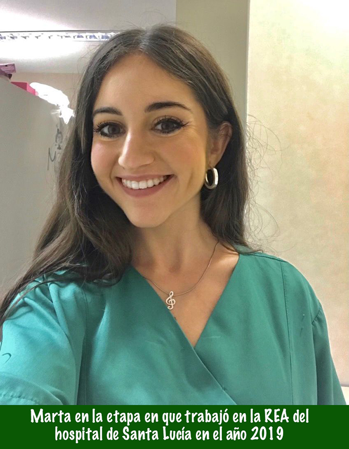 Marta estudió en el colegio Carmelitas de La Unión, desde donde pasó al IES María Cegarra y de ahí a la Universidad de Murcia, donde se graduó en Enfermería en 2019. Antes ya había iniciado las prácticas, entre las que figuraron la planta de cardiología del Santa Lucía. Siguió con los estudios y también sacó el máster en 2020, año en el que llevó a cabo el contrato laboral de tres meses antes mentado.
