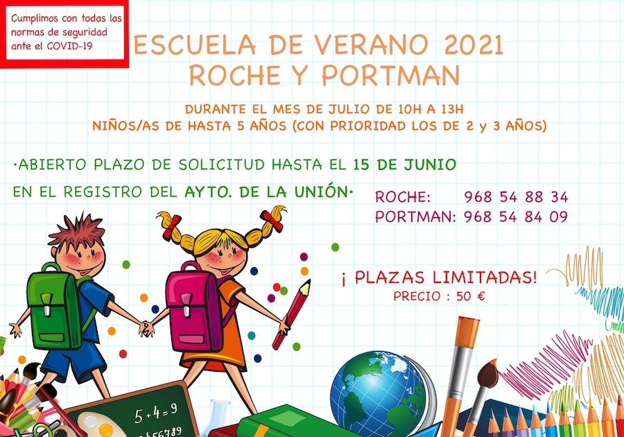El Ayuntamiento de La Unión ha abierto el período de solicitud de plazas para las escuelas de verano durante el mes de julio en los puntos de atención a la infancia (PAI) de ambas pedanías, las cuales están dirigidas a niños de hasta 5 años de edad, donde tendrán prioridad los solicitantes de 2 y 3 años hasta completar las plazas ya que son limitadas por restricciones de las medidas sanitarias generadas por el COVID-19.
