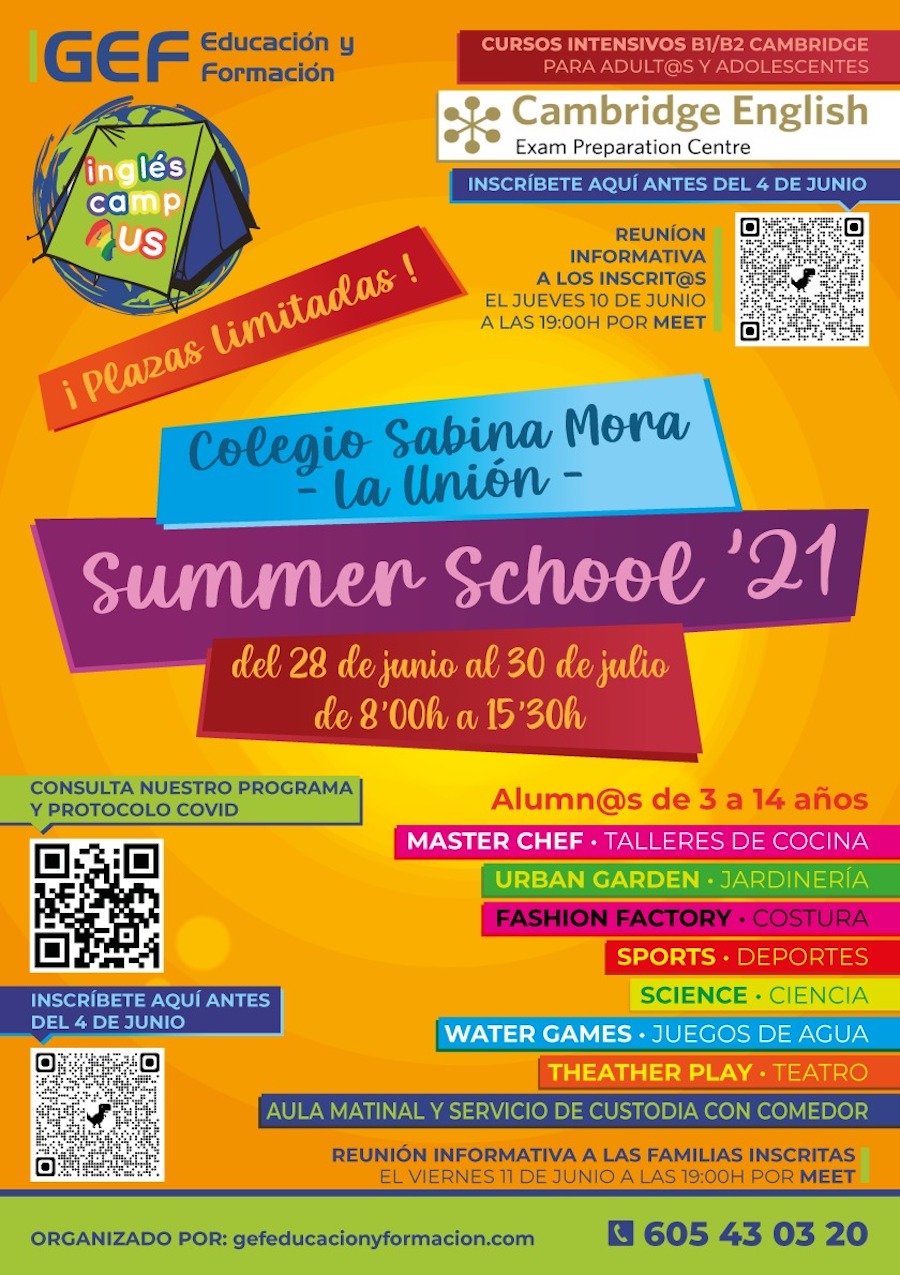 La cooperativa de enseñanza de La Unión abre el plazo para apuntarse a su 'Summer School 21', que se desarrollará del 28 de junio al 30 de julio de 8 a 15.30 horas, abarcando una amplia variedad de actividades, como talleres de cocina, jardinería, costura, deportes, ciencia, juegos de agua y teatro. Está dirigida a alumnos de 3 a 14 años de edad y las plazas son limitadas. También está la propuesta de cursos intensivos B1/B2 Cambridge para adultos y adolescentes, estando el plazo abierto hasta el 4 de junio.