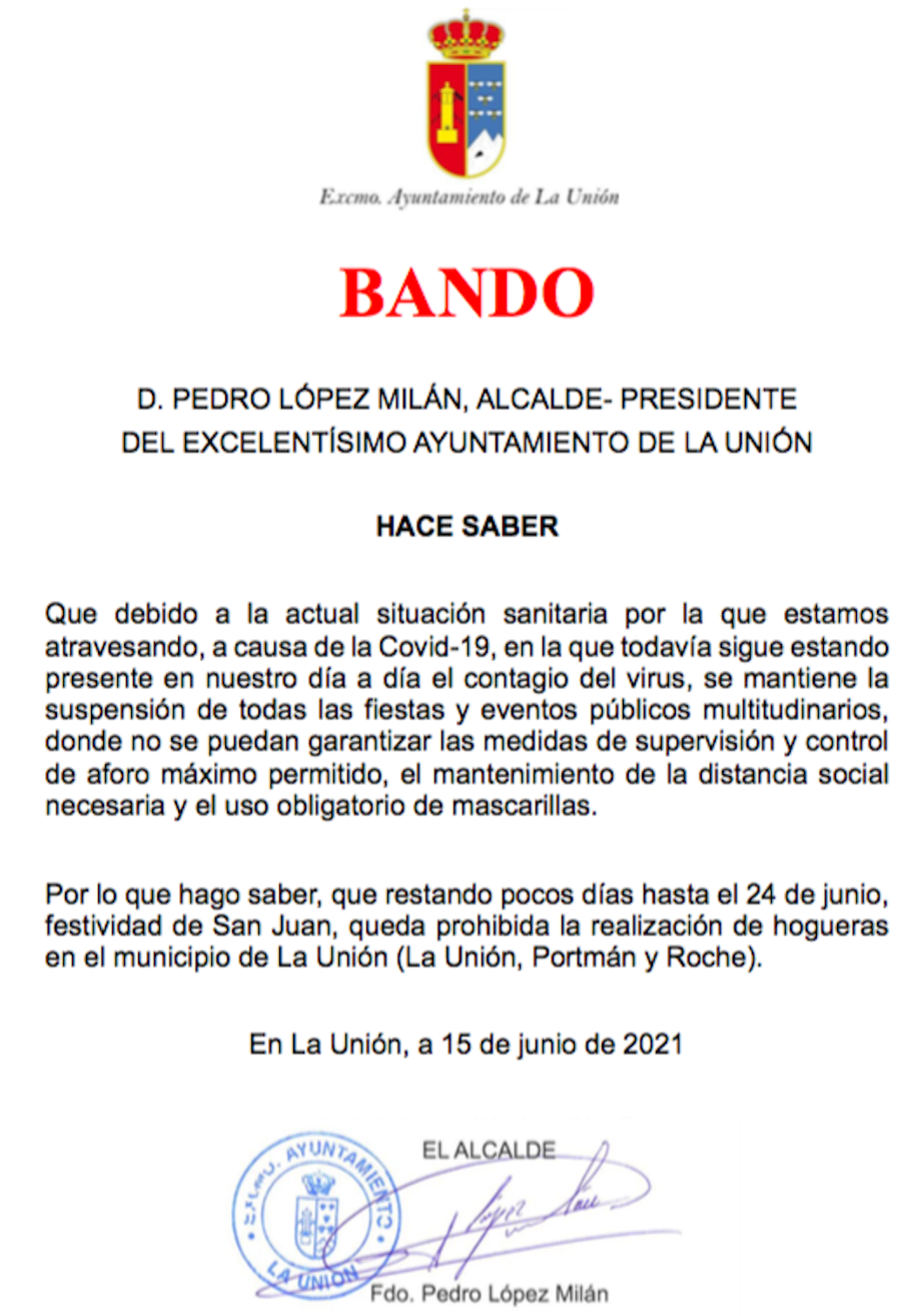El alcalde ha emitido un bando en el que justifica la decisión para todo el municipio en la actual situación sanitaria, recordando que se mantiene la suspensión de todas las fiestas y eventos públicos multitudinarios.