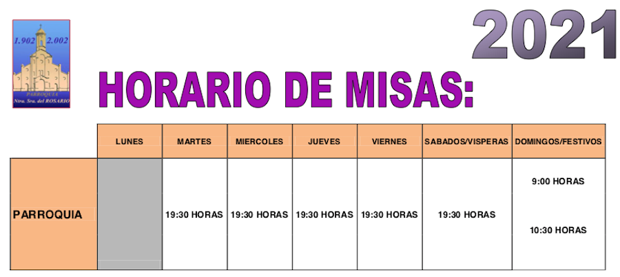 La llegada de la época estival varía las horas de las eucaristías semanales. Se suprime la misa de los domingos a las doce horas y la misa del asilo de ese día a las nueve, hasta huevo aviso, se traslada a la parroquia.