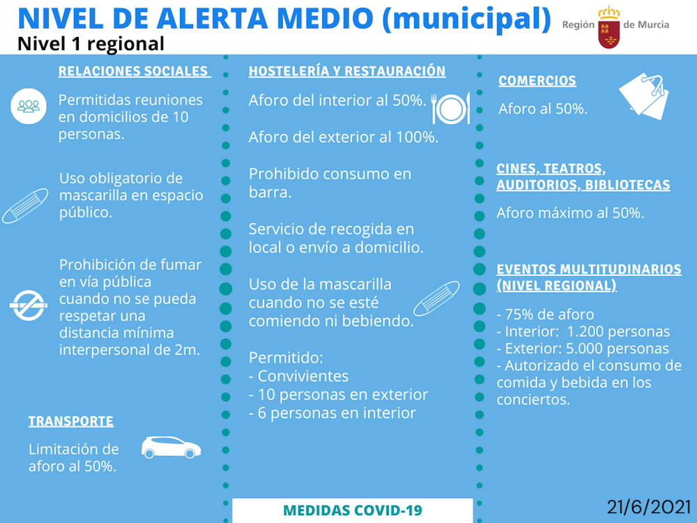 Respecto a los niveles de alerta municipal, no se contempla decretar el nivel Muy Alto o Alto en ningún municipio. En nivel de alerta Medio hay 12 localidades: Bullas, Calasparra, Cieza, La Unión, Las Torres de Cotillas, Los Alcázares, Lorca, Moratalla, Murcia, Puerto Lumbreras, San Javier y San Pedro del Pinatar.