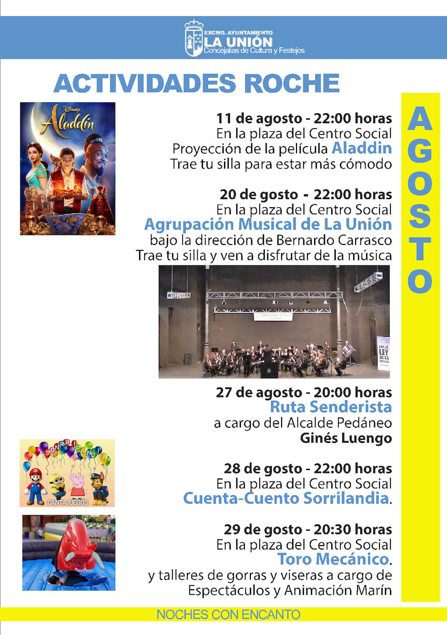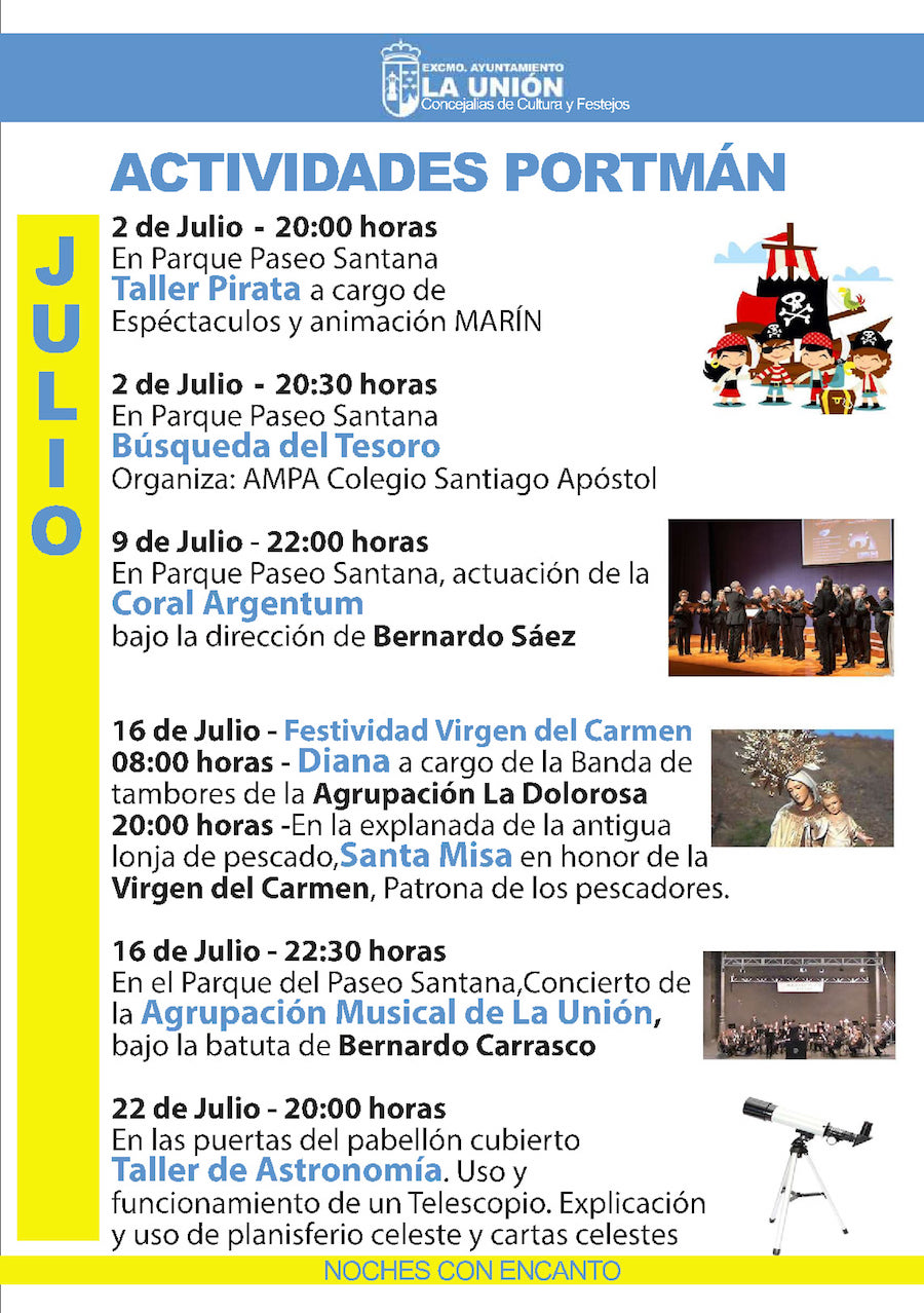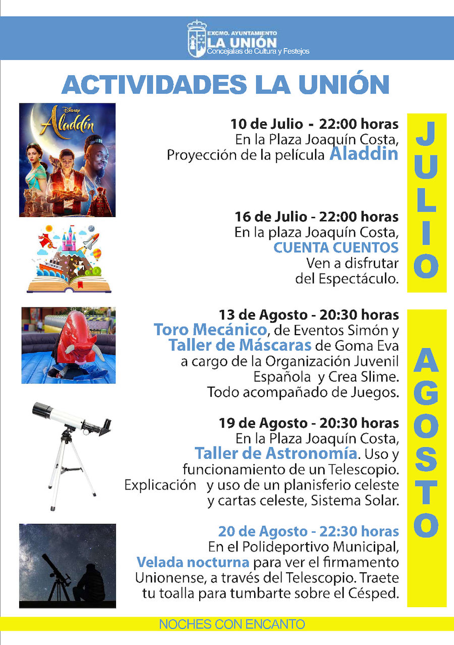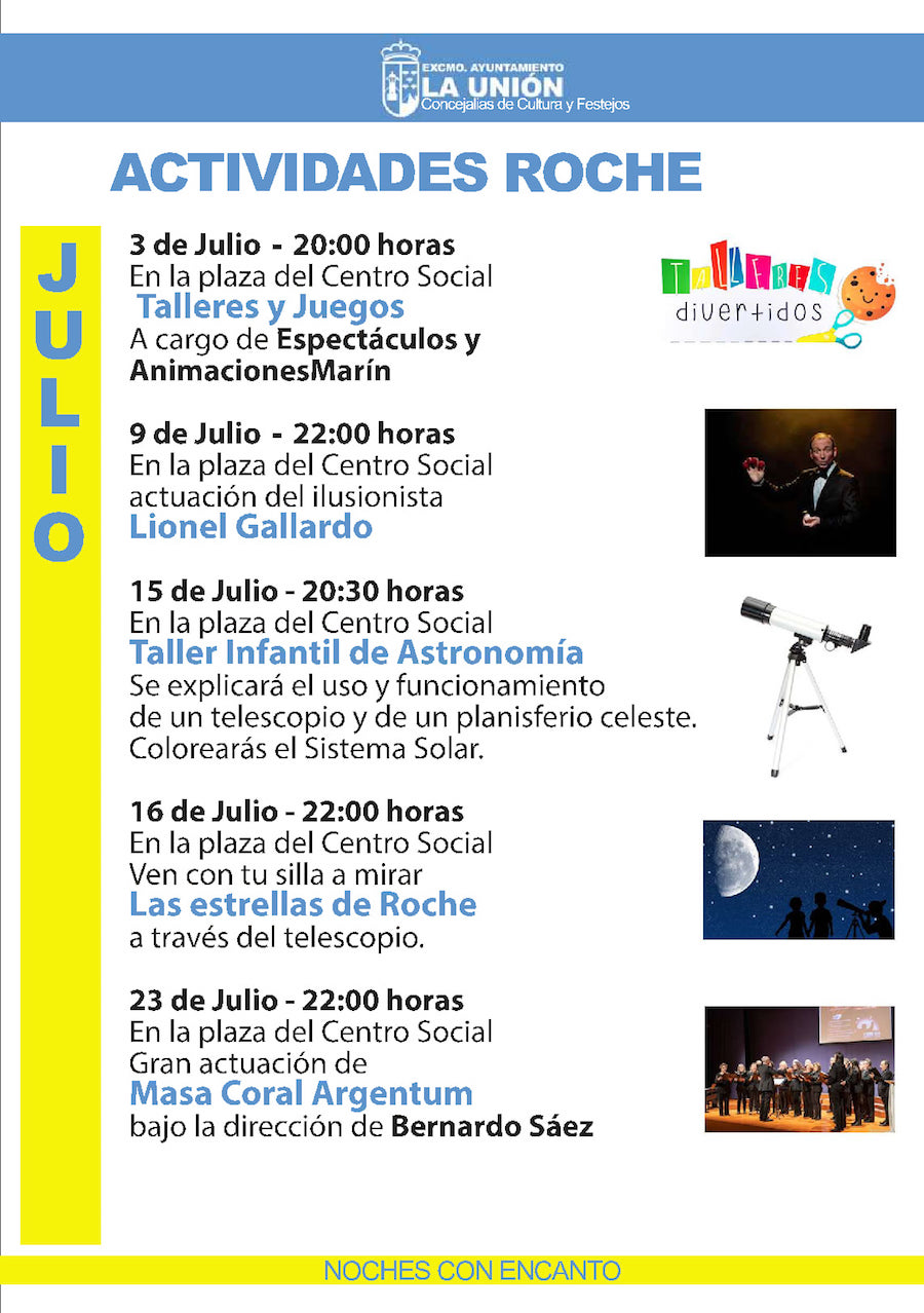 El programa estival de ocio se va a desarrollar durante julio y agosto en La Unión, Roche y Portmán con una variada programación que incluye música, magia, talleres, astronomía, cuentacuentos, senderismo, etc.