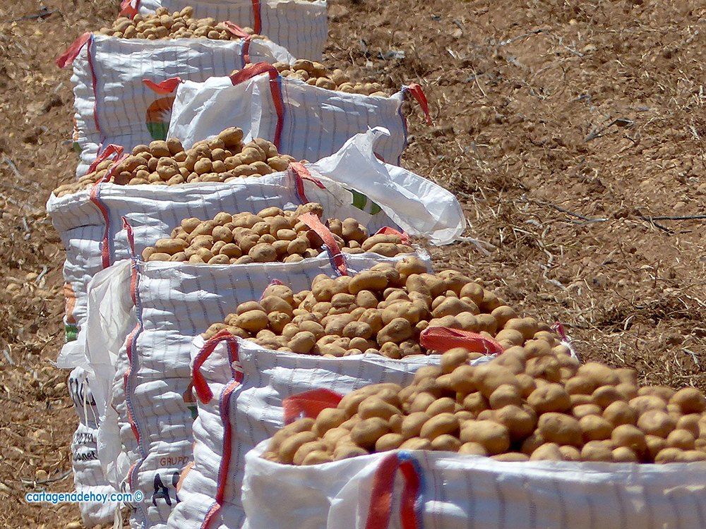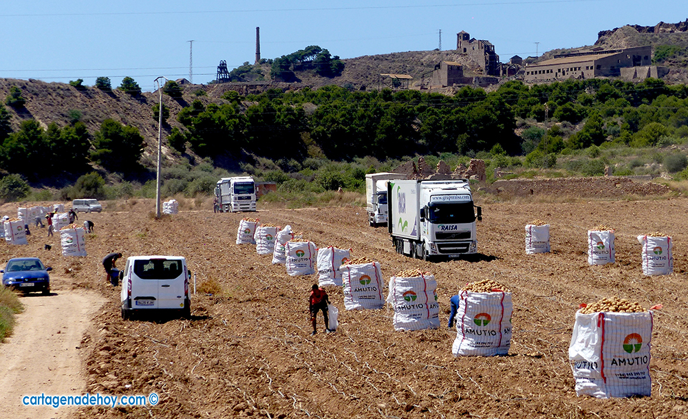 La imagen corresponde a un terreno que linda con el polígono de Lo Bolarín durante la reciente recogida de este tubérculo para su distribución. Como sucede en estos casos, las que se quedan en la tierra suelen ser recogidas por vecinos, muchos de los cuales (aunque siempre están sabrosas solas o en compañía) consideran que tienen un sabor exquisito ya que están recién cogidas y todavía no llevan productos para su conservación.