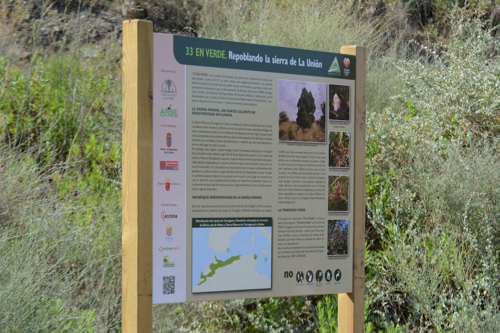 El Ayuntamiento de La Unión y la Asociación ARBA Cartagena- La Unión han instalado en la zona del 33 una serie de carteles indicativos que ubican al visitante dentro de la Sierra Minera y explican su origen, historia y actual recuperación medioambiental basada en el hábitat del ciprés de Cartagena, un tipo de bosque propio de las montañas del Atlas, entre Marruecos, Argelia y Túnez, que en Europa solo se encuentra en Cartagena y La Unión.