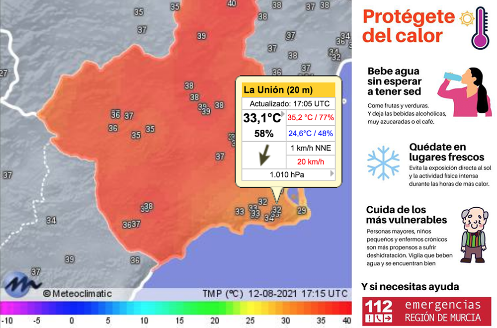 Según el comunicado elaborado por la Agencia de Estatal de Meteorología y remitida por el Centro Nacional de Emergencias (CENEM), está previsto una ola de calor procedente del norte de África llegue a alcanzar valores superiores a los 40º C en la mayor parte de la Región de Murcia hasta el domingo y tormentas eléctricas para el viernes.
