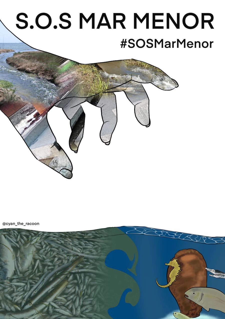 Una chica de La Unión ha creado un cartel que recoge la tragedia sucedida estos días en la albufera con la mano del hombre amenazando a las especies marina.