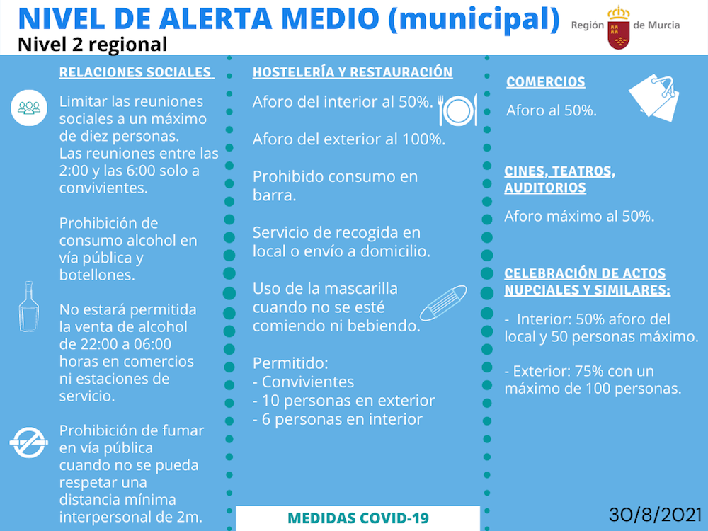 En un Nivel de Alerta 2- Medio se encuentran siete municipios esta semana: Abanilla, Alcantarilla, Alguazas, Librilla, Mula, La Unión y Yecla. El resto, 29 municipios, se sitúan en un Nivel 3- Alto.