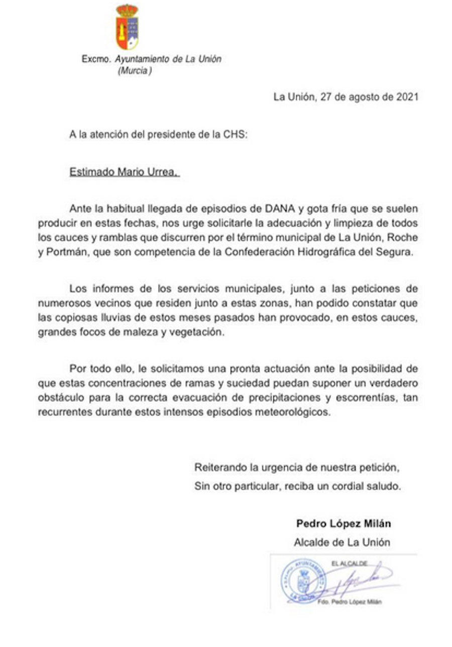 El alcalde, Pedro López Milán, cursaba el pasado 27 de agosto una solicitud urgente a la Confederación Hidrográfica del Segura (CHS) donde se exigía la necesaria limpieza de malezas y vegetación existente en esas zonas que dificultarían la correcta evacuación de escorrentías ante posibles fenómenos de lluvias torrenciales en la comarca.